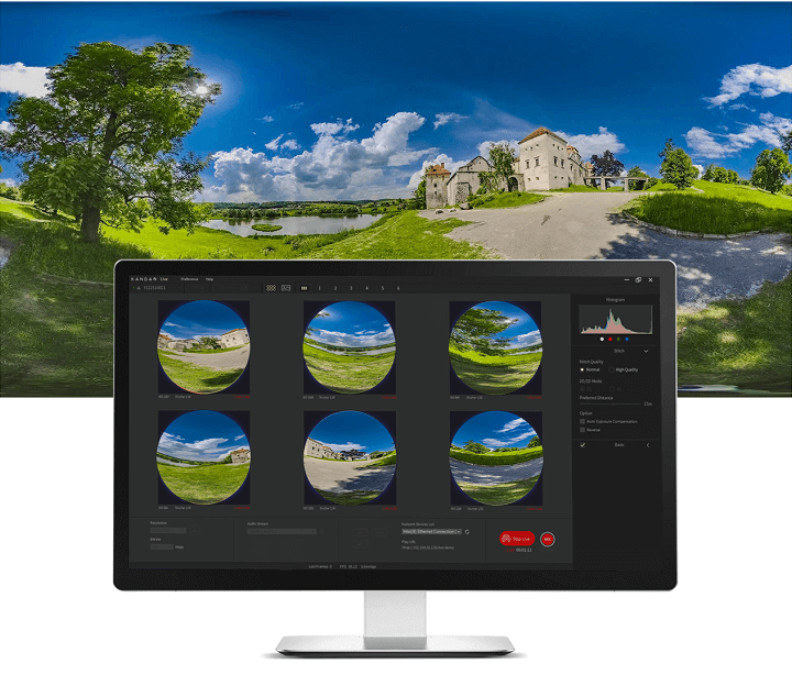 To ensure the real-time live with 8K quality, the Obsidian 360 live streaming camera outputs six streams of synchronized 4K video sources. They are then stitched and encoding by the powerful Kandao live 8K software, to generate and share 2D/3D 360 video live stream in real time watch.